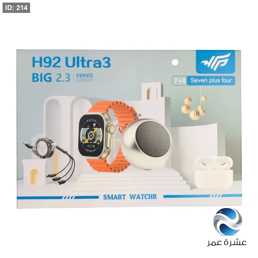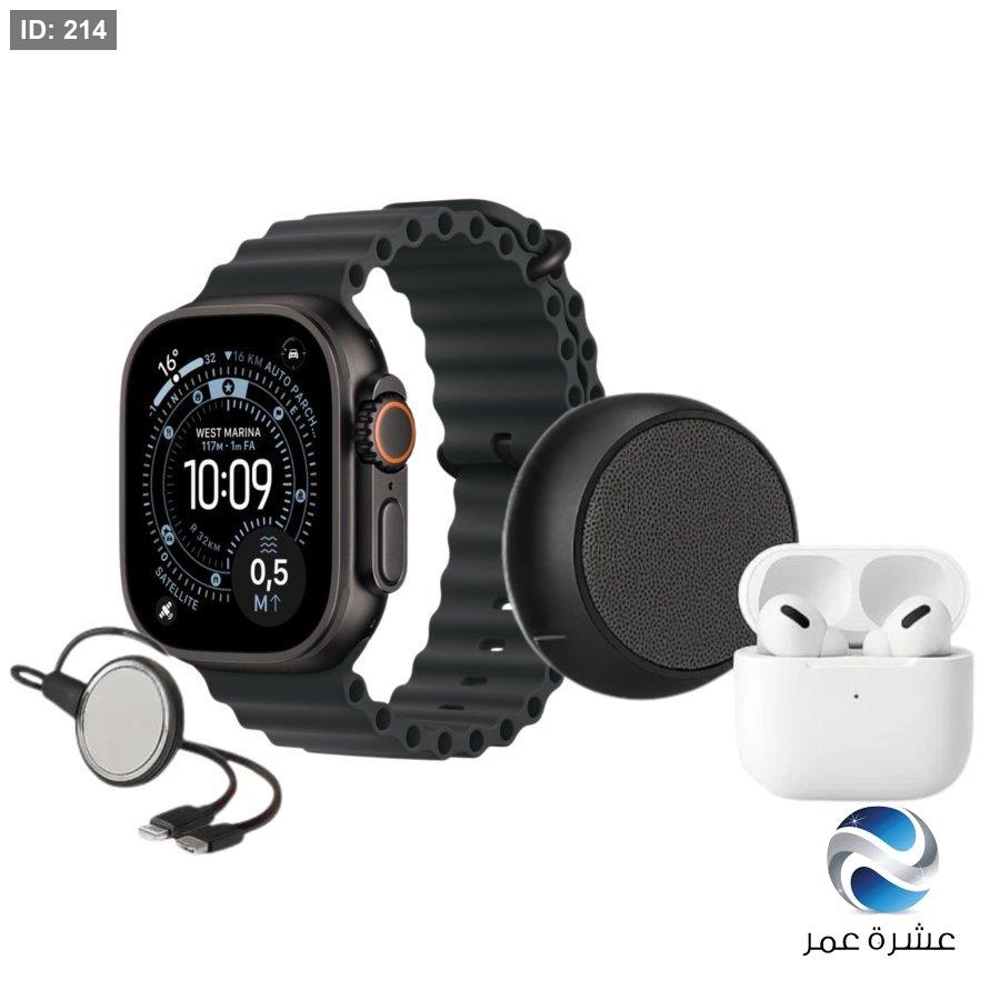 - تتضمن المجموعة ساعة ذكية، 7 أحزمة، سماعات أذن لاسلكية (AirPods)، مكبر صوت بلوتوث، وكابل شحن