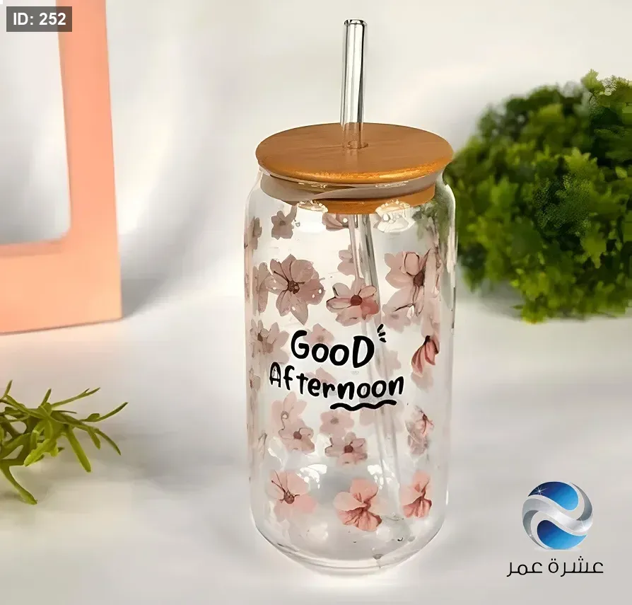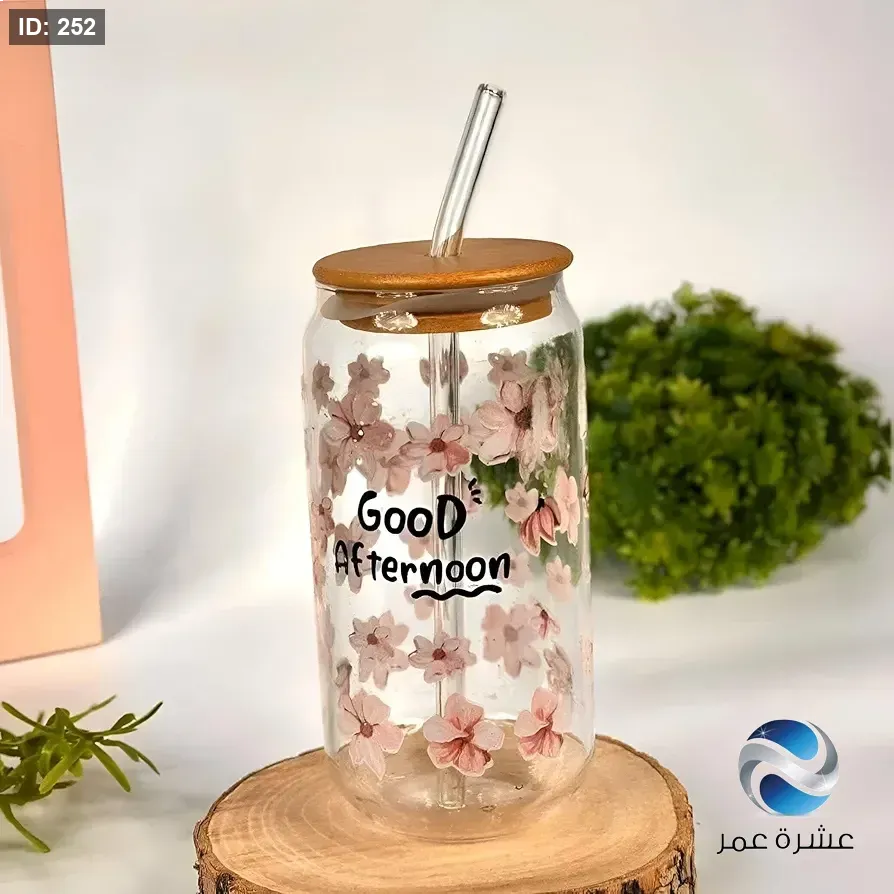 كوب زجاجي شفاف بغطاء من الخيزران وشاليمو (مصاصة) زجاجية، مزين برسومات زهور بيضاء ووردية وعبارة "Good Afternoon