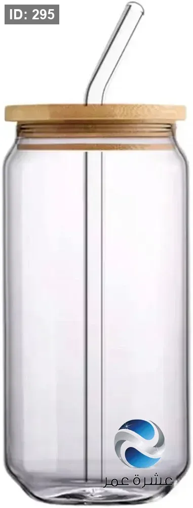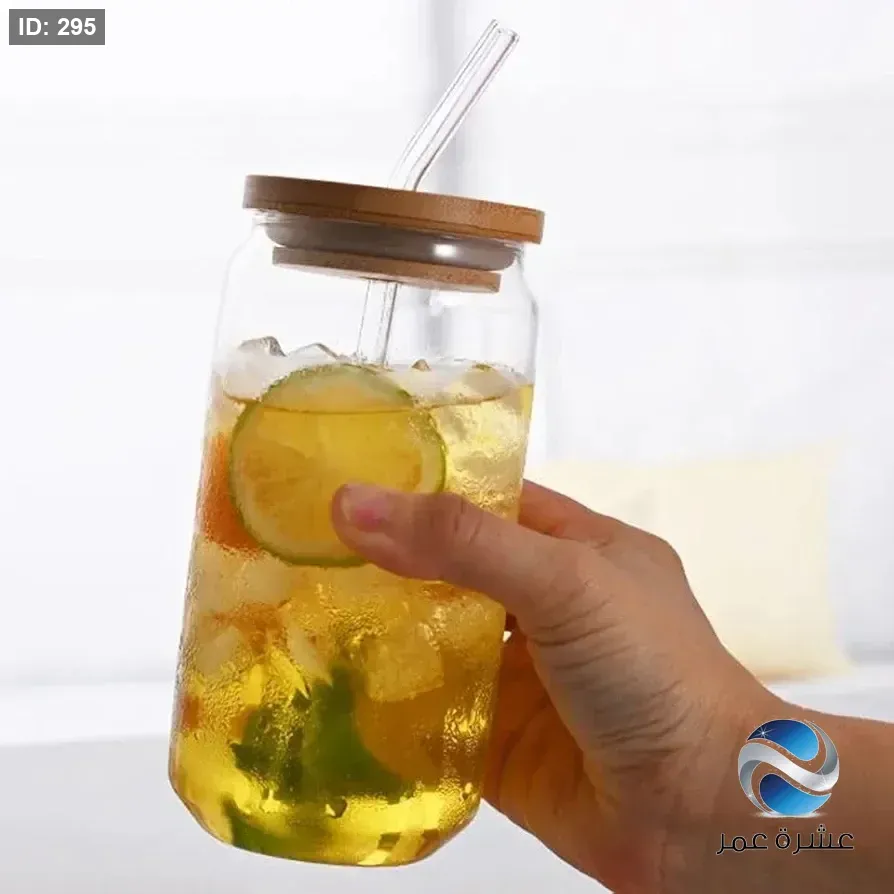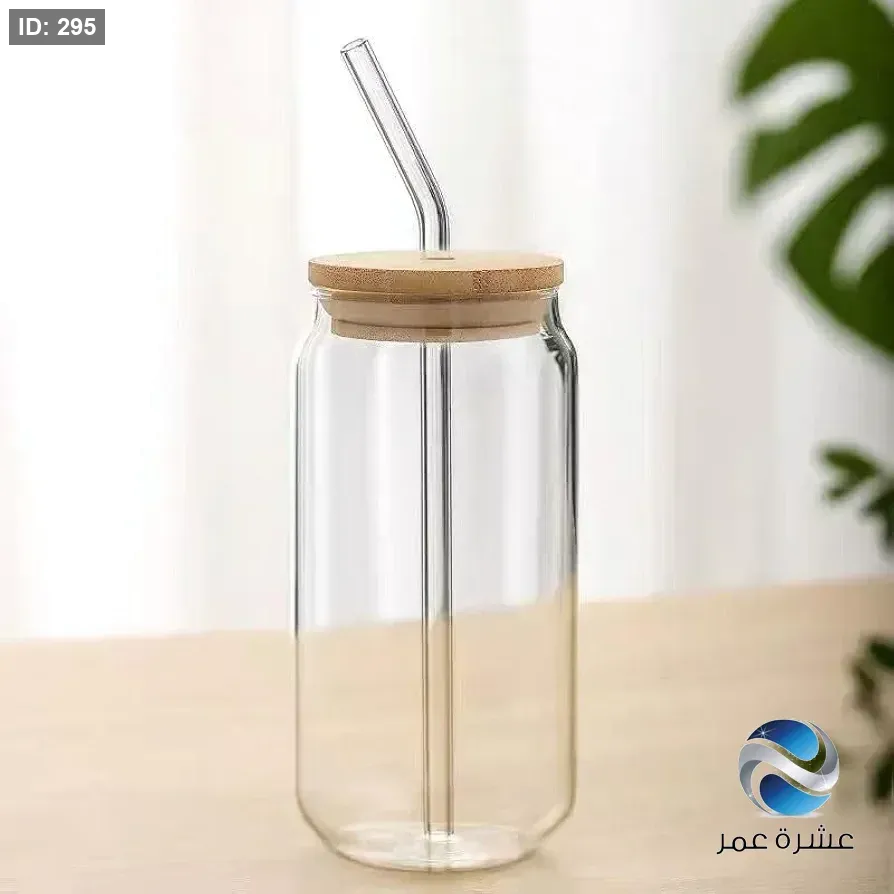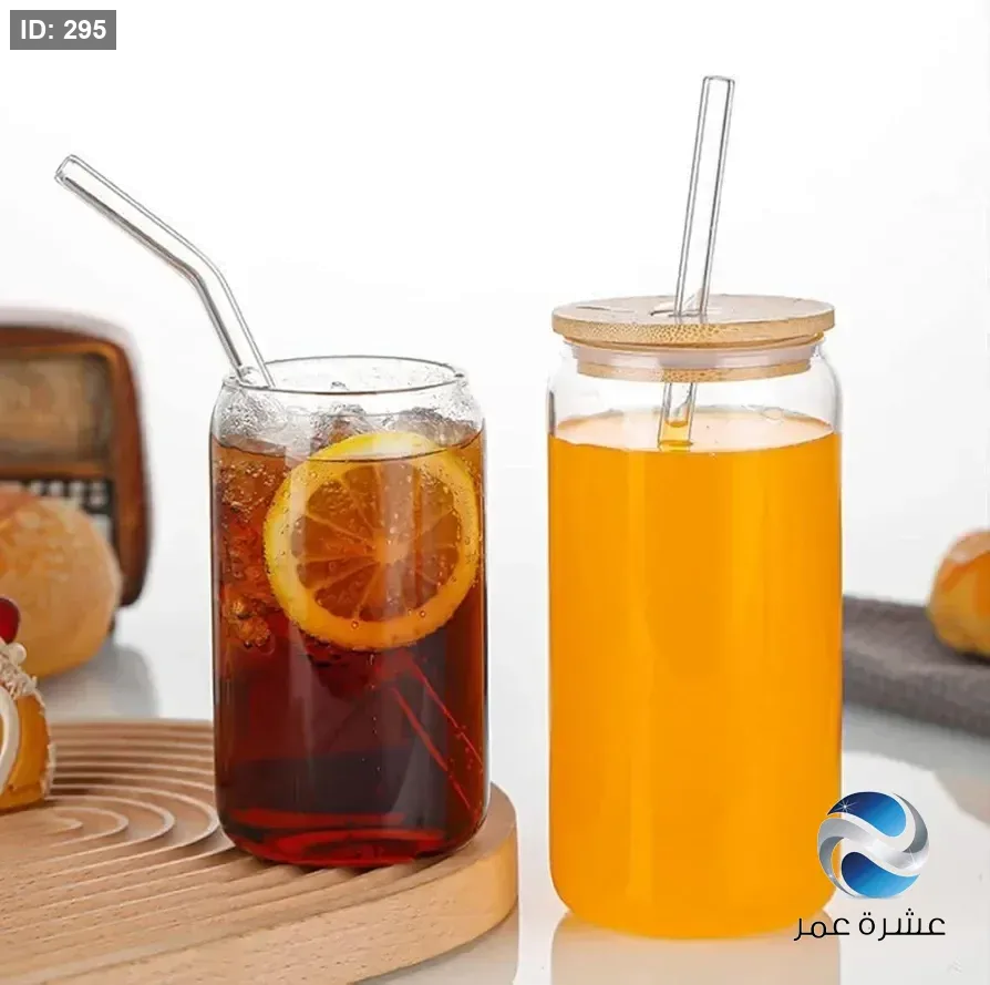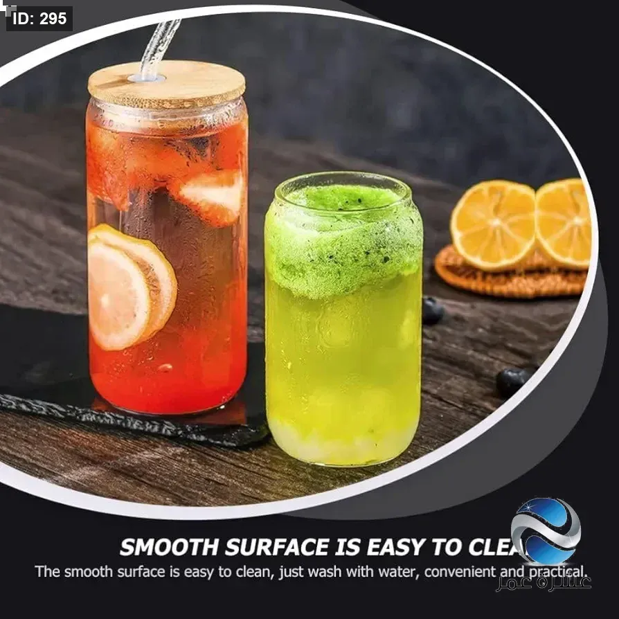 كوب زجاجي شفاف على شكل علبة مشروبات غازية مزود بغطاء خشبي وشفاطة زجاجية للمشروبات الباردة والقهوة المثلجة