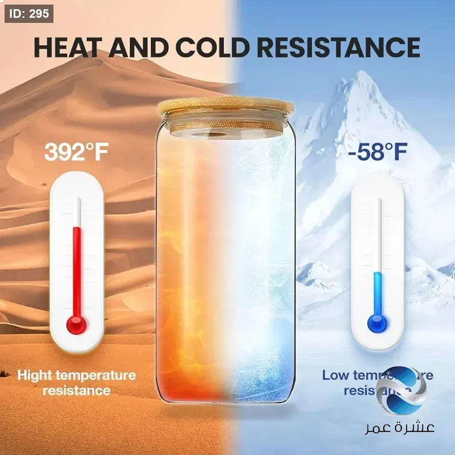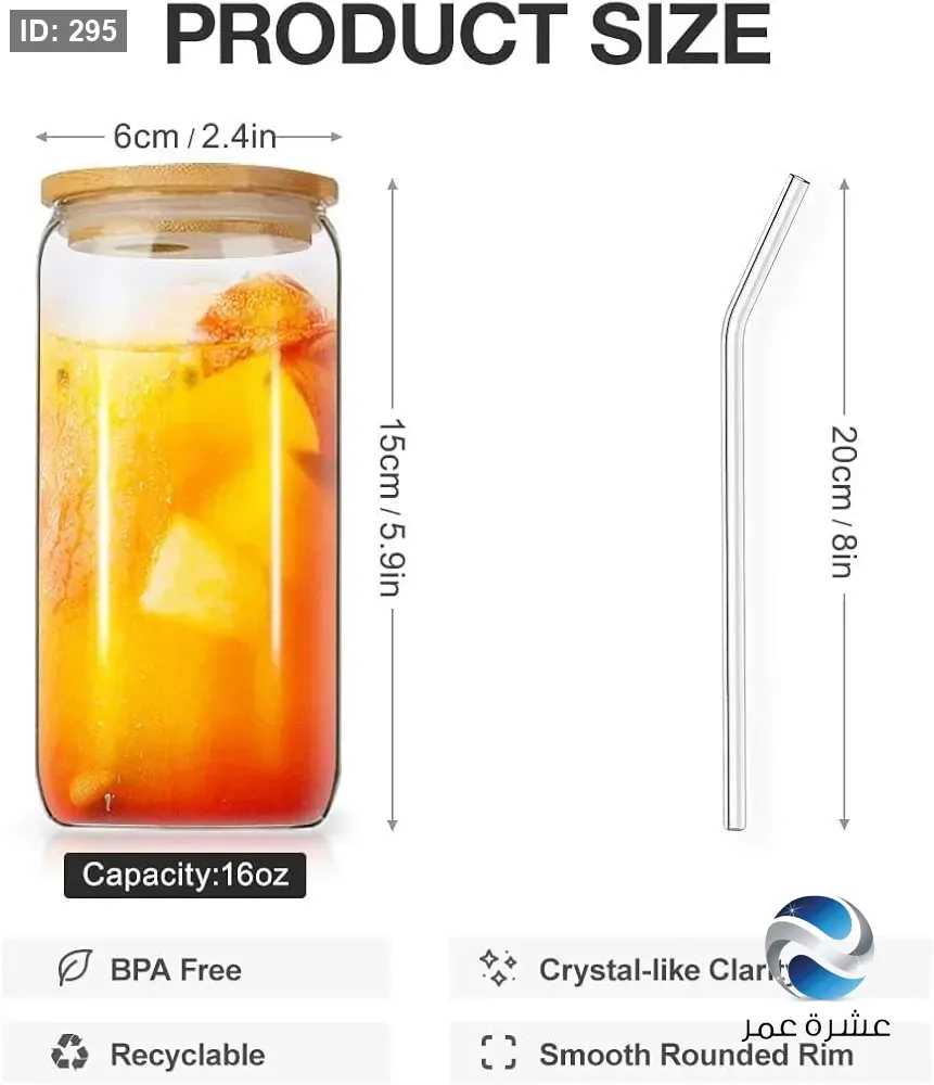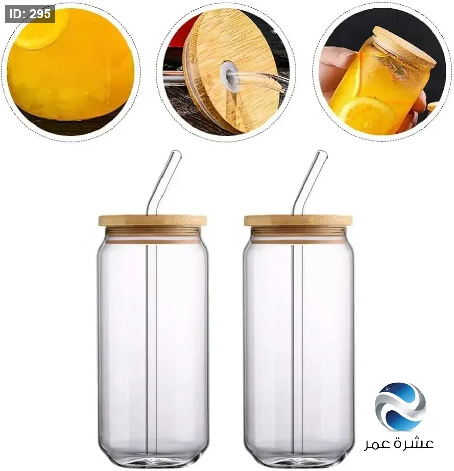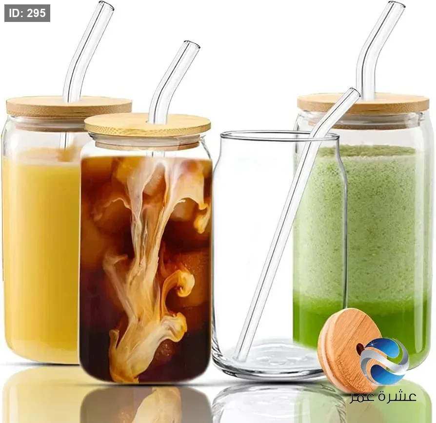 كوب زجاجي شفاف على شكل علبة مشروبات غازية مزود بغطاء خشبي وشفاطة زجاجية للمشروبات الباردة والقهوة المثلجة