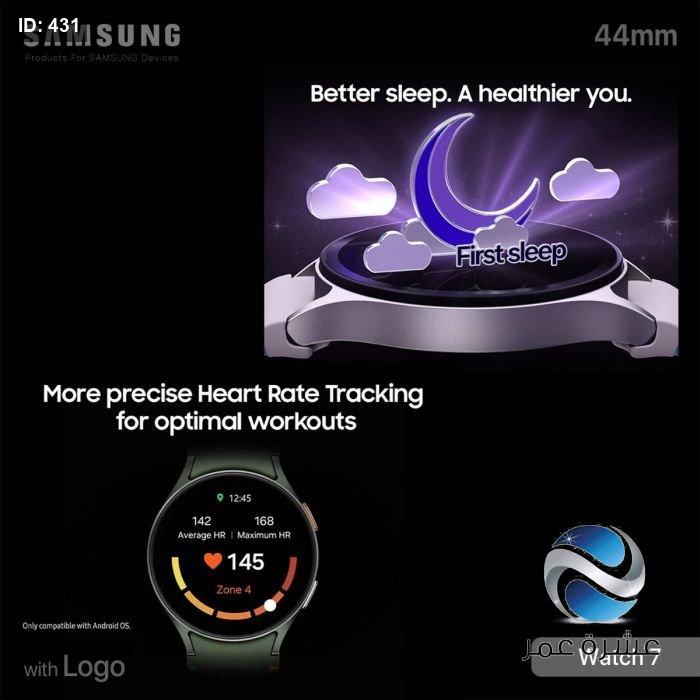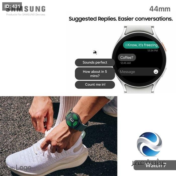 ساعة سامسونج Watch 7 الذكية بشاشة لمس كاملة، وحجم شاشة 1.5 انش، مع اصدار بلوتوث 5.3، تعمل بنظامي اندرويد وiOS، وتدعم الشحن المغناطيسي اللاسلكي.